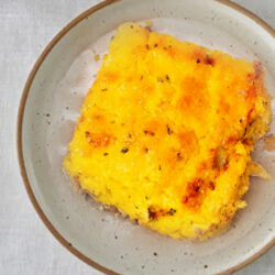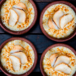 BERENJENAS ASADAS AL HORNO CON BRÓCOLI, OSTIONES, LECHE DE ALMENDRAS Y MANGO